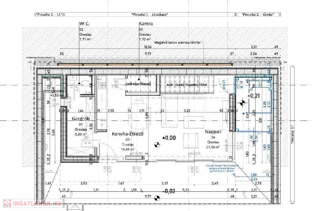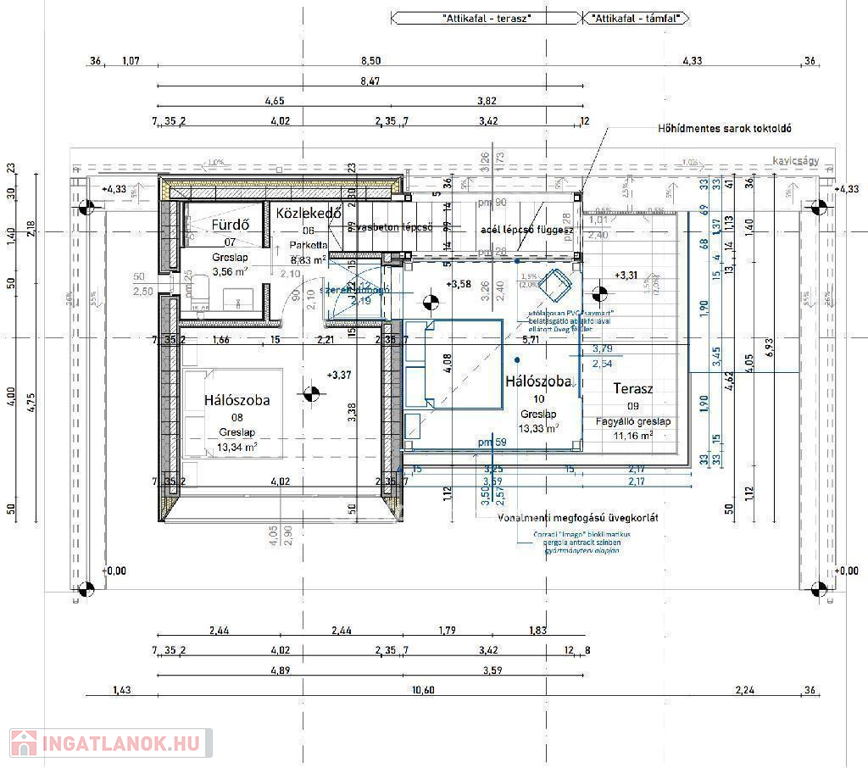 - 8,9 m2-es közlekedő (belső acél lépcsőfeljáró függesztőkkel)